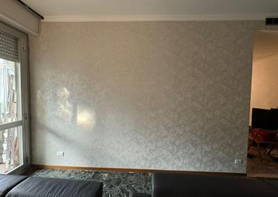 Le pareti sono state preparate con cura, livellando e trattando le superfici per garantire un’applicazione perfetta della carta da parati e una posa impeccabile della boiserie.